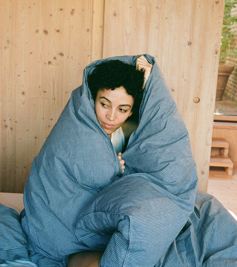 Duvet Set and Pillow Case Mix Blue from Aiayu is a bedding that offers a crisp and breathable texture for a comfortable night’s sleep. Designed for a single duvet, it features a relaxed, softly wrinkled look with a subtle Aiayu logo, stitched hem, and practical zip closure. The matching pillowcase has an elegant envelope closure. Sustainably made and thoughtfully finished, each set comes in a reusable cotton bag.