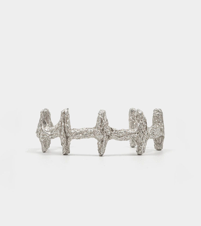 The Gathering Bracelet by Sol Seok, designed by Ali Gallefoss. Incense holder and armring in 925 sterling silver. Worn on body, it reads as a sculpture. Placed, it becomes an altar. Holds standard Japanese incense sticks. Wear solo or stack with our jewellery for stronger presence.