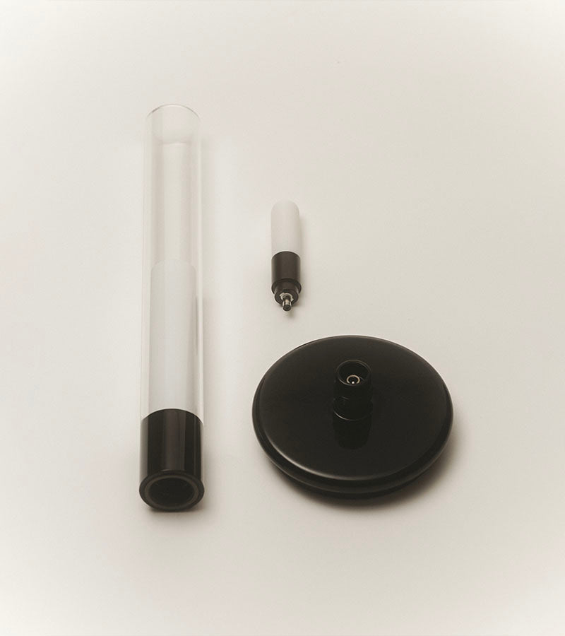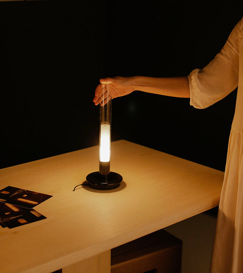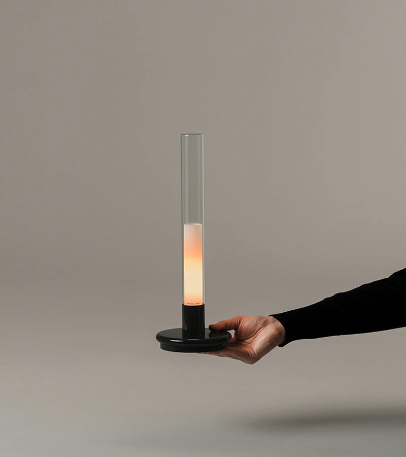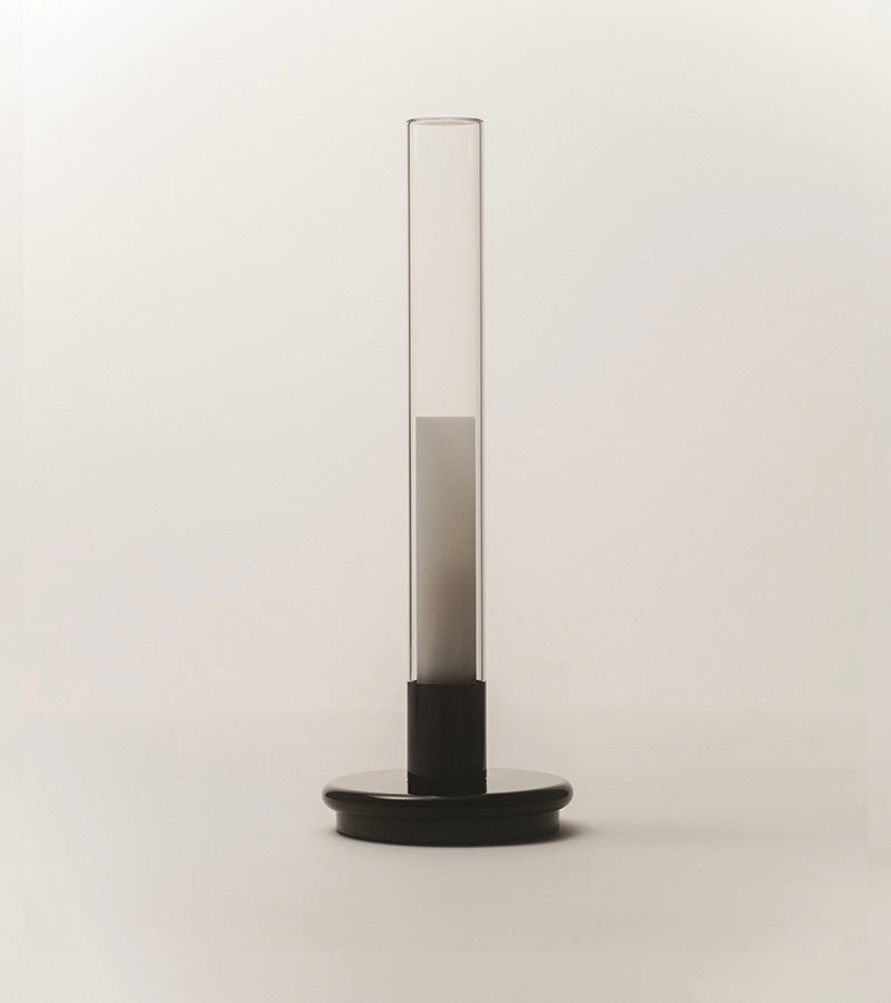 The Sylvestrina Black portable table lamp by Santa & Cole is an elegant and modern lamp with subtle references to traditional oil lamps. Freed from oils, kerosene or cords, and powered by an efficient rechargeable battery, Sylvestrina, very robust in its delicacy, comes in handy for every occasion. Simply press the outer tube down to activate the switch, adjusting accordingly, to full, medium or zero strength. It is charged by induction, and its light really is that of an oil lamp.