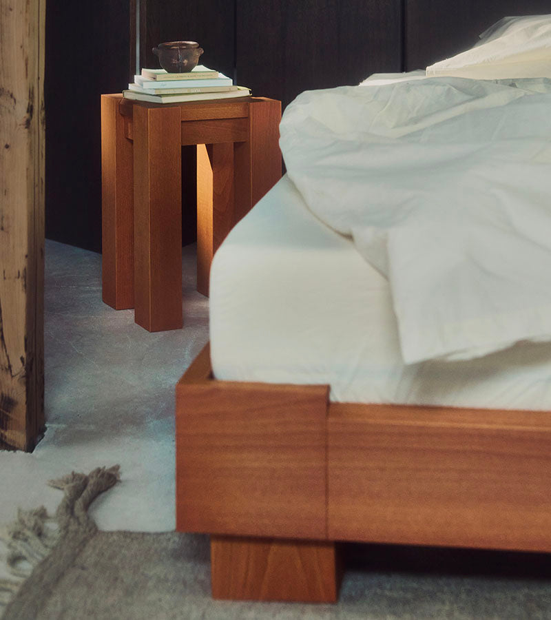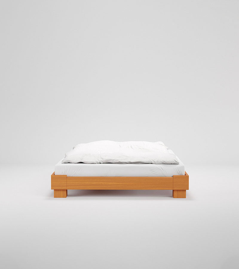 The Cubico Bed Frame in Light Amber from RYE is a contemporary interpretation of the low-profile platform bed, designed by Italian designer Martina Branchetti. Crafted from solid beech wood, its horizontal form features subtly chamfered edges resting on four sturdy, pillar-like legs that lend the piece a grounded, architectural character. The deep Light Amber stain recalls to traditional Mediterranean mid-century furniture design.
